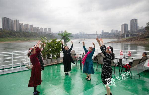 在首航的交运轮渡12号上,几位乘客载歌载舞。华龙网-新重庆客户端记者 张质 摄