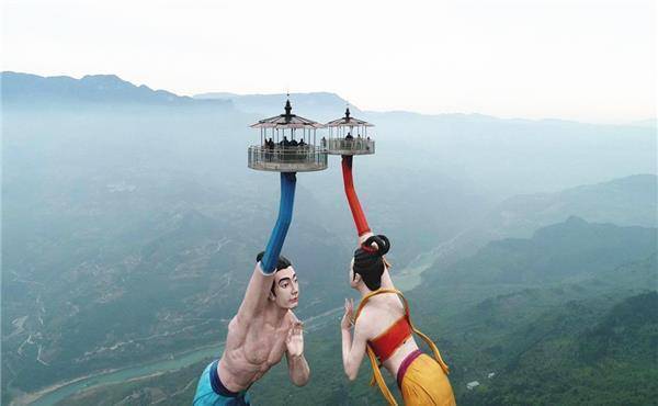 而各大景点为了吸引游客,也是一个劲开发新的项目,其中好玩有趣的雕塑就比较受欢迎,像是格鲁吉亚的男女旋转雕像,就让人们深深感受爱情的真谛。而在我国的重庆也有一处类似的景点,它的名字叫做“飞天之吻”,雕塑设计灵感来源于民间爱情传说,茶花女和白马仙人的故事,听起来还是十分吸引人的,但是不少体验过的游客,纷纷表示期望越高失望越大,这玩意太奇葩。这两个一男一女的雕塑,启动后会从地面旋转升起,到达制高点时的样子,就像是情侣在亲吻,而两个平台上的游客们也能在此相遇,但是由于雕像面部设计一言难尽,让很多游客大呼:土到爆了!不过也有人表示项目的高空体验感还是十分不错的,因此也值得一玩。