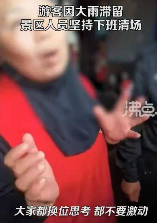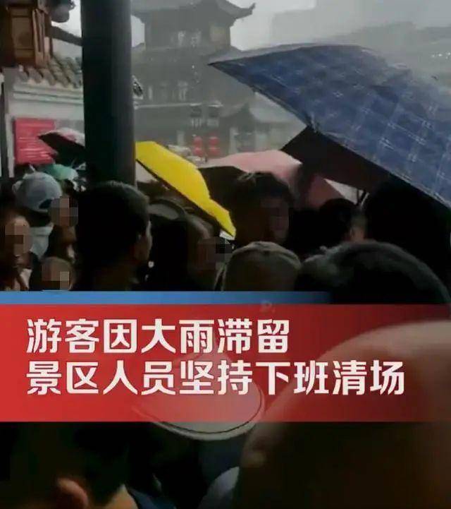 视频中,游客称这么大的雨,你要把人清到哪里去?工作人员回答:“我们也要关门下班啊,我们不下班是不是啊?”游客表示,孩子身上都湿了,“你们都下班了,游客怎么办啊?”工作人员称:“我怎么知道游客怎么办啊?”