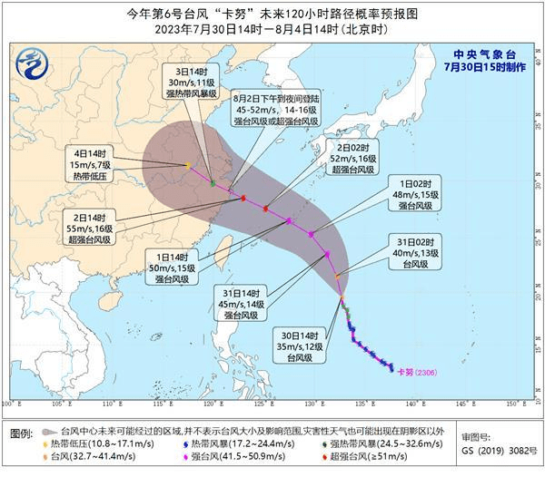 3.台风“卡努”逐渐向浙江沿海靠近:今年第6号台风“卡努”已于30日凌晨加强为强热带风暴级,预计将以每小时20-25公里的速度向北偏西方向移动,31日在琉球群岛附近海域转向西北方向移动,31日夜间至8月1日早晨进入东海,逐渐向浙江沿海靠近,强度逐渐增强,最大强度可达强台风级(45-50米/秒,14-15级)。(人民日报)