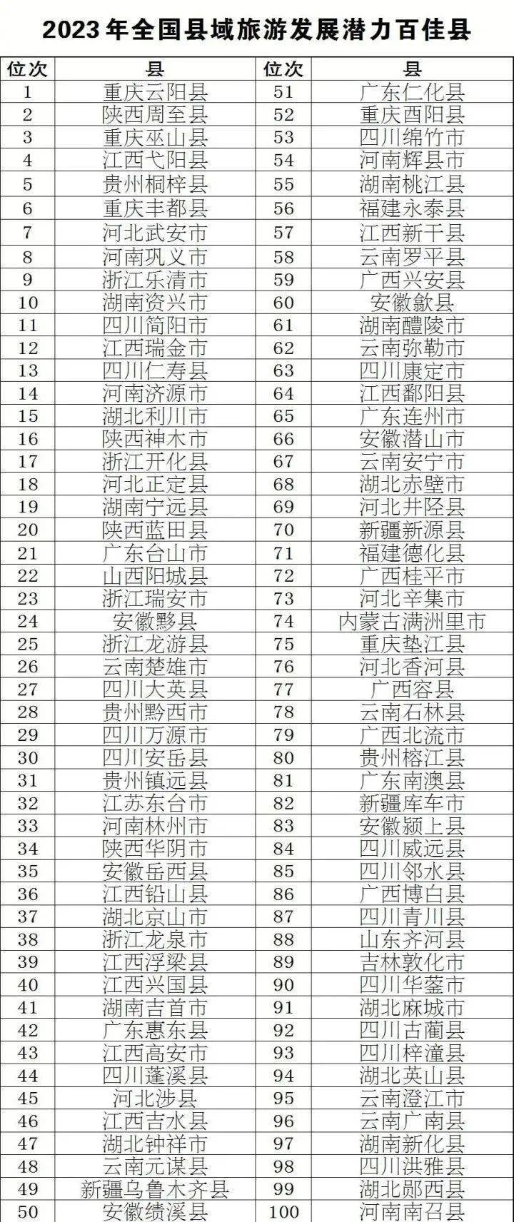 近日,全国县域旅游研究课题组、华夏佰强旅游咨询中心联合发布第五届全国县域旅游研究成果《全国县域旅游高质量发展研究报告2023》暨“2023年全国县域旅游综合实力百强县”“2023年全国县域旅游发展潜力百佳县”名单。