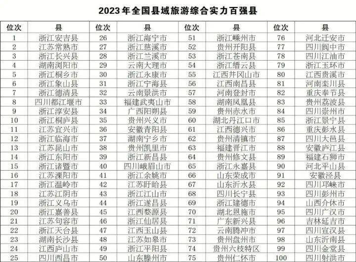 “2023年全国县域旅游综合实力百强县”分布在18个省份。具体分布为:浙江32席,四川14席,贵州10席,江苏8席,江西7席,湖南和山东均占4席,安徽、福建和云南均占3席,河北、河南、湖北和重庆各占2席,广东、广西、吉林和山西均为1席。