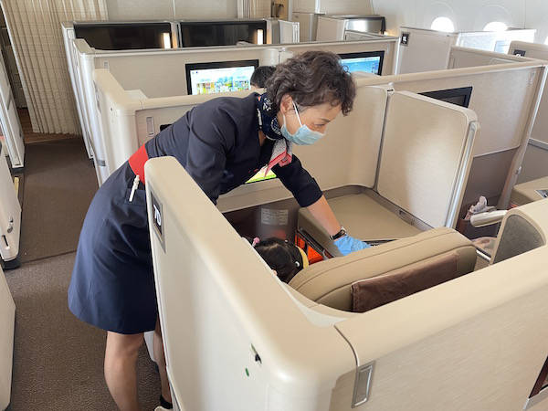 图说:高璟在航班上为一名小旅客检查安全带是否绑好