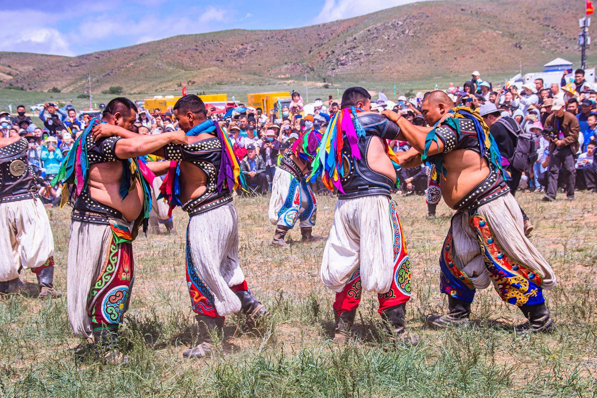 身材魁梧、健壮的蒙族男子身穿摔跤用的牛皮坎肩,上面钉满了银质的“大号图钉”,后背有代表着“吉祥”类的图腾。肥大的白色摔跤裤外面有绣着图腾的套裤,脚上则是蒙古花皮靴,脖子上挂着五彩飘带,颜色五彩缤纷,但这一身“行头”就足够吸引眼球。