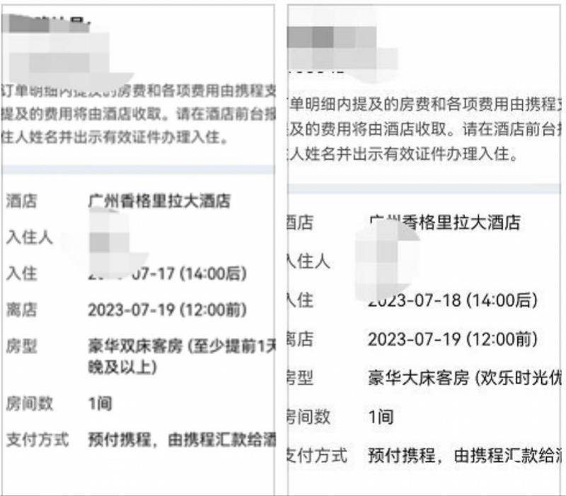 据了解,王女士与同事因工作需要来广州出差,她提前在携程平台上订购了广州香格里拉酒店的两间客房,并支付了房费。