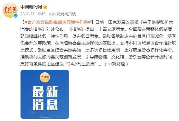 日前,国家发展改革委《关于恢复和扩大消费的措施》对外公布。《措施》提出,丰富文旅消费。全面落实带薪休假制度,鼓励错峰休假、弹性作息,促进假日消费。鼓励各地制定实施景区门票减免、淡季免费开放等政策。在保障游客自主选择权的基础上,支持不同区域景区合作推行联票模式,鼓励景区结合实际实施一票多次多日使用制,更好满足游客多样化需求。推动夜间文旅消费规范创新发展,引导博物馆、文化馆、游乐园等延长开放时间,支持有条件的地区建设“24小时生活圈”。(中新财经)