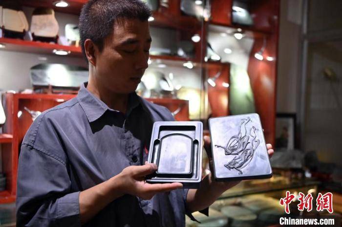 图为洮砚手艺人李江平展示“双飞天”洮砚作品。(资料图)中新社记者 九美旦增 摄