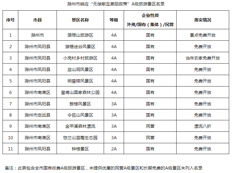 为进一步落实省政府办公厅《关于实施无偿献血激励政策的通知》,根据《滁州市人民政府关于贯彻落实无偿献血激励政策的通知》精神,在全市A级旅游景区贯彻激励政策,现就有关事项进行明确。