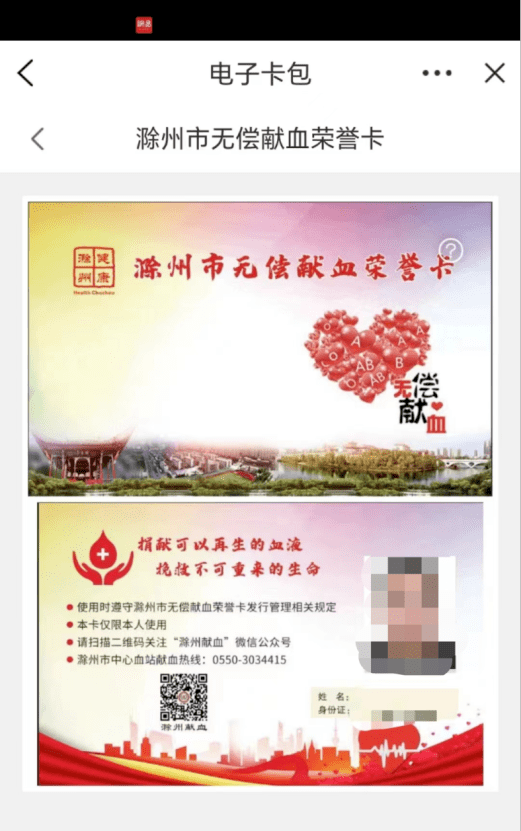 享受激励政策人员主动向景区工作人员出示本人通过皖事通平台申领的“滁州市无偿献血荣誉卡”,工作人员核对无误后,即可享受激励政策。“滁州市无偿献血荣誉卡”(电子卡)样式如下。