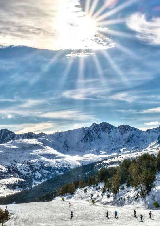 被自然环绕的安道尔全境有超过72座山峰,甚至一些山峰的海拔高于2000米。安道尔隶属山地气候,因此冬季寒冷漫长,每年高山积雪长达8个月,是天然的滑雪胜地,建有欧洲首屈一指的滑雪场和温泉度假村,是欧洲居民假期“躲清闲”的好去处。