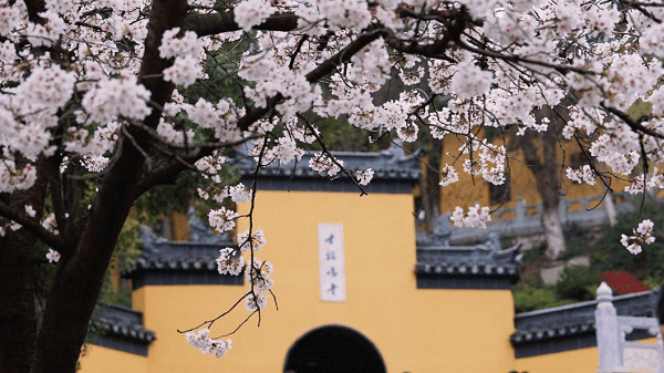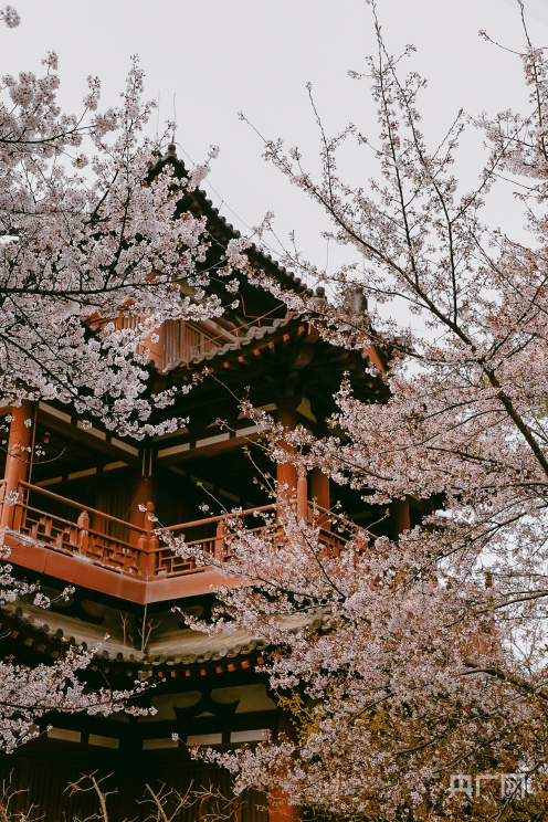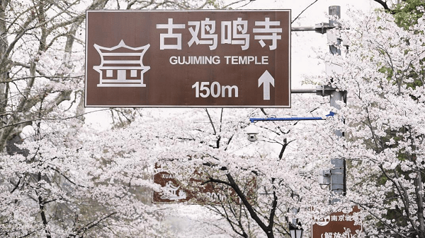 在与长安遥相呼应的六朝古都江苏南京,鸡鸣寺游人如织,樱花灿若云霞,铺满街头,笼于上空,游人仿佛行走在画卷中。