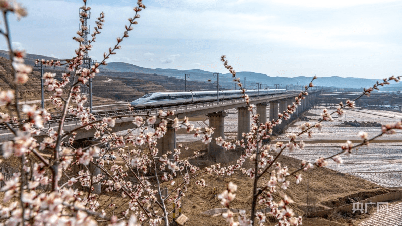 旅途始于路上。甘肃省定西市通渭县境内,一列列动车在西北旱塬宝兰铁路客运专线的店子特大桥上疾驰而过。高速前进的列车,伴着桥边的田畴沃野和灼灼的桃花,奔向下一站。