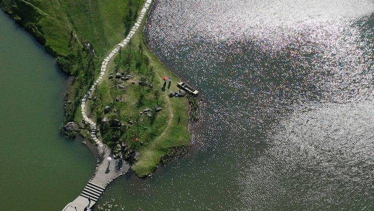 7月28日,游客在湖南省郴州市北湖区仰天湖大草原的湖边游览(无人机照片)。新华社记者 赵众志 摄