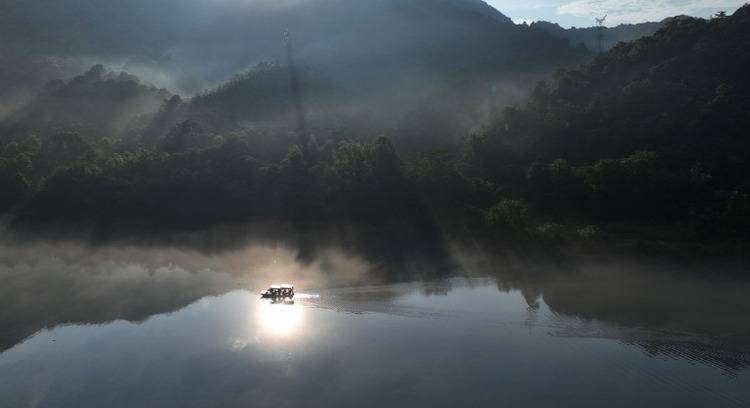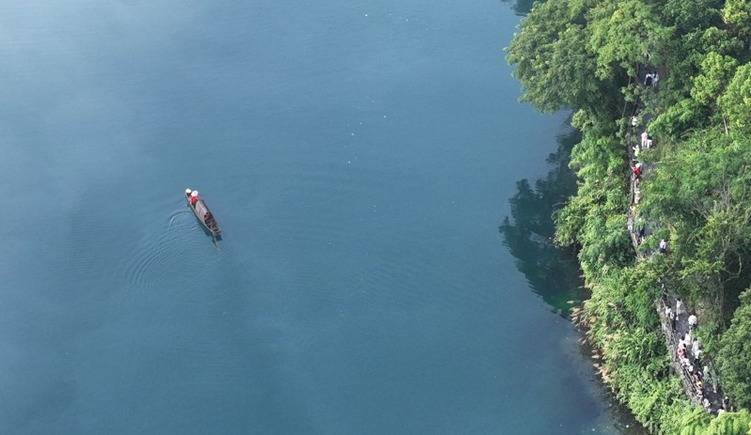 7月26日,游客在湖南省资兴市小东江上乘船游览(无人机照片)。新华社记者 赵众志 摄