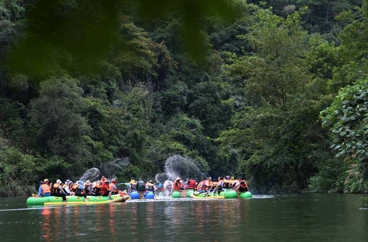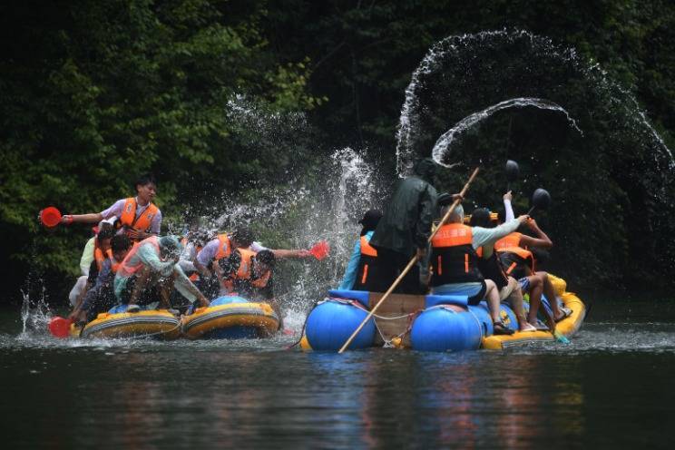 7月27日,游客在湖南省资兴市东江湖景区体验东江漂流。新华社记者 赵众志 摄