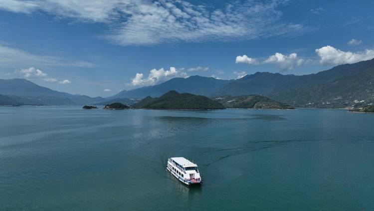 7月26日,游客在湖南省资兴市东江湖乘船游览(无人机照片)。新华社记者 赵众志 摄