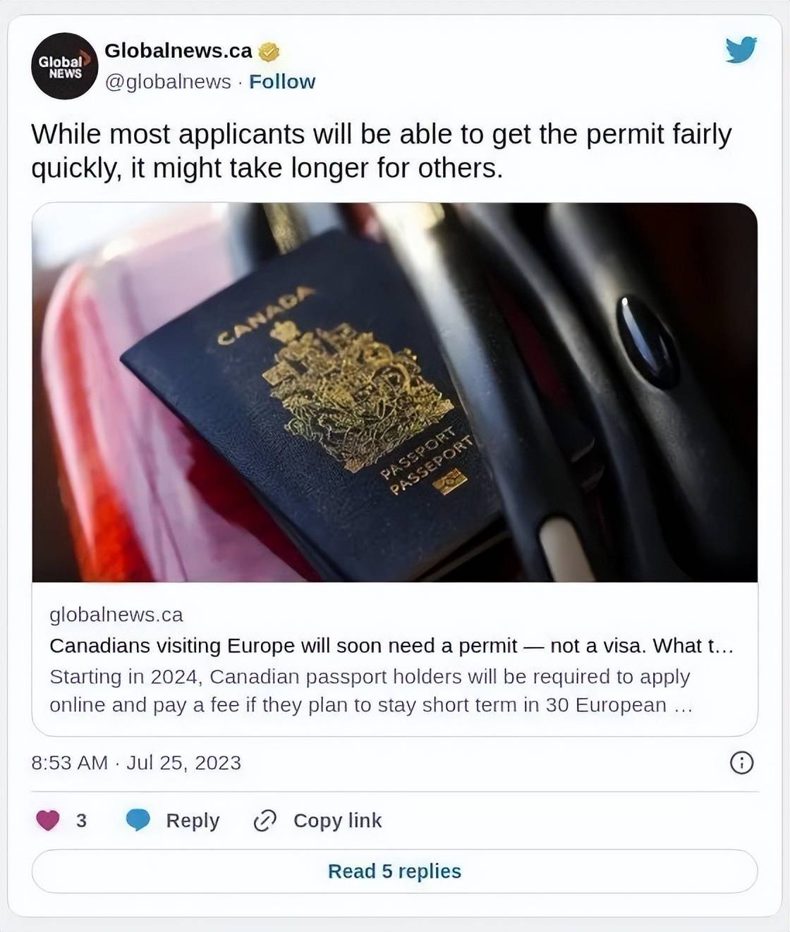 根据欧盟的规定,从2024年开始,加拿大护照持有人如果计划在180天内在30个欧盟国家中的任何一个停留最多90天,则需要网上申请欧洲旅行信息和授权系统 (ETIAS)。