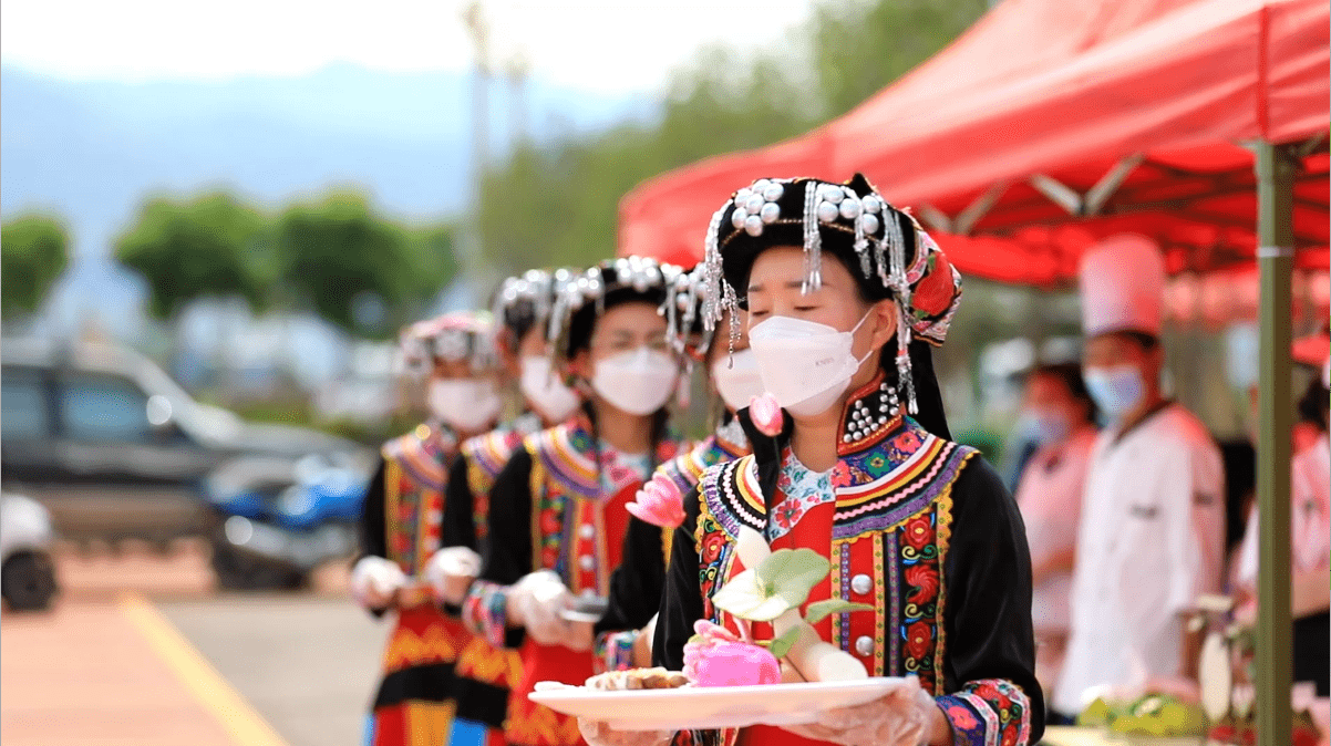 端着完成餐品的民族服饰女子(央广网发 姚安县委宣传部供图)