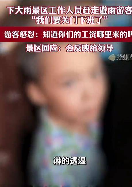 据悉,当时正天下大雨,游客便想进景区躲雨,没想到却被景区工作人员拒绝了。游客中随行还有老人孩子,都已全身被淋湿。