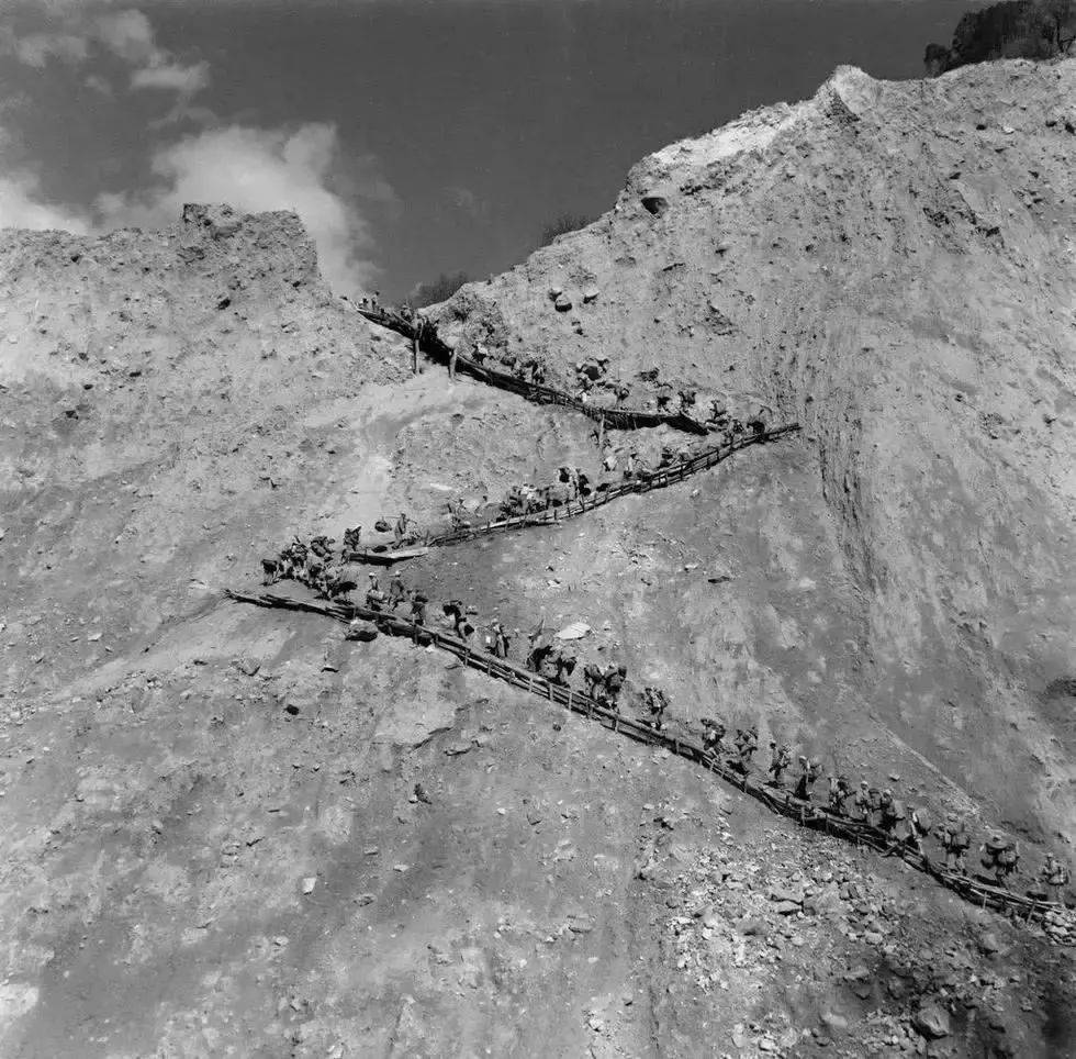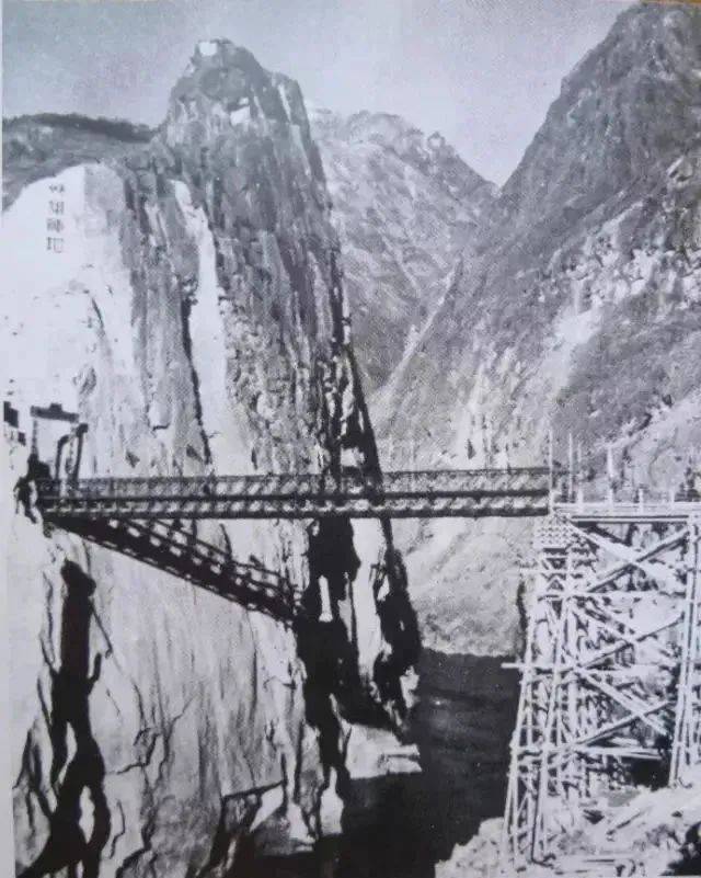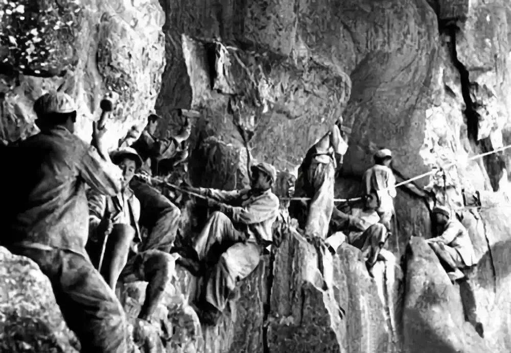 在零下30度的天气里,战士穿着单衣,用绳子把自己绑在绝壁上施工。由于大型设备无法运输,战士们只能用钢钎与大锤刀削斧砍,而他们唯一的安全保障,就是那根长绳。就这样,十八军战士用铁刀、铁锤,以及自己的性命,硬生生在绝壁上凿出一条路。