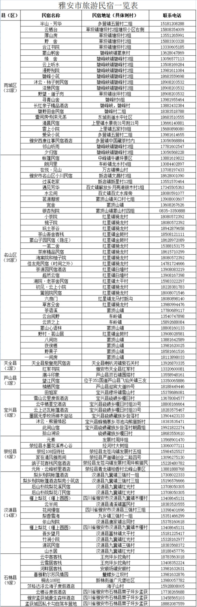 蒙顶山旅游景区、上里古镇景区、东拉山大峡谷景区、安顺场景区、熊猫古城景区、金凤山景区、云峰山景区、神木垒景区、花海果香旅游景区、周公山景区、二郎山喇叭河景区、龙门古镇旅游景区、飞仙关旅游景区、蜂桶寨邓池沟景区、灵关石城旅游景区、汉姜古城旅游景区、龙苍沟翠叠景区、大川河旅游景区、牛碾坪景区、月亮湖景区、王岗坪景区、严道古城景区