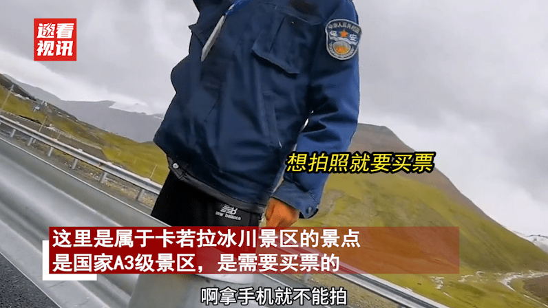 游客不解地询问,难道站在国道上观赏风景也不行吗?男子坚持认为所有来旅游的人都需要购买门票,因为风景是用来欣赏的。虽然卡若拉冰川景区与349国道只相隔一两公里,但这里毕竟是国家的路边景区。