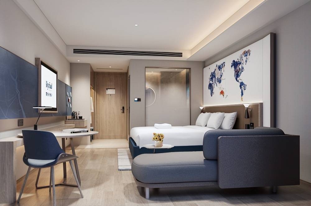 独具特色的“享睡港湾”升级了客房内的睡卧区域体验,通过灯塔外观的床头灯和世界地图背景墙营造环抱式睡眠环境,为宾客打造旅途中安心休憩的舒适“港湾”。房间里的蓝色电视背板隐藏着城市探索地图,呈现在地城市的交通线路,并标识出当地地标,为旅客探索城市提供便利。客房内设置语音指令、魔方感应和传统模式等多种客控方式,以满足当下不同人群对智能设备的使用习惯。