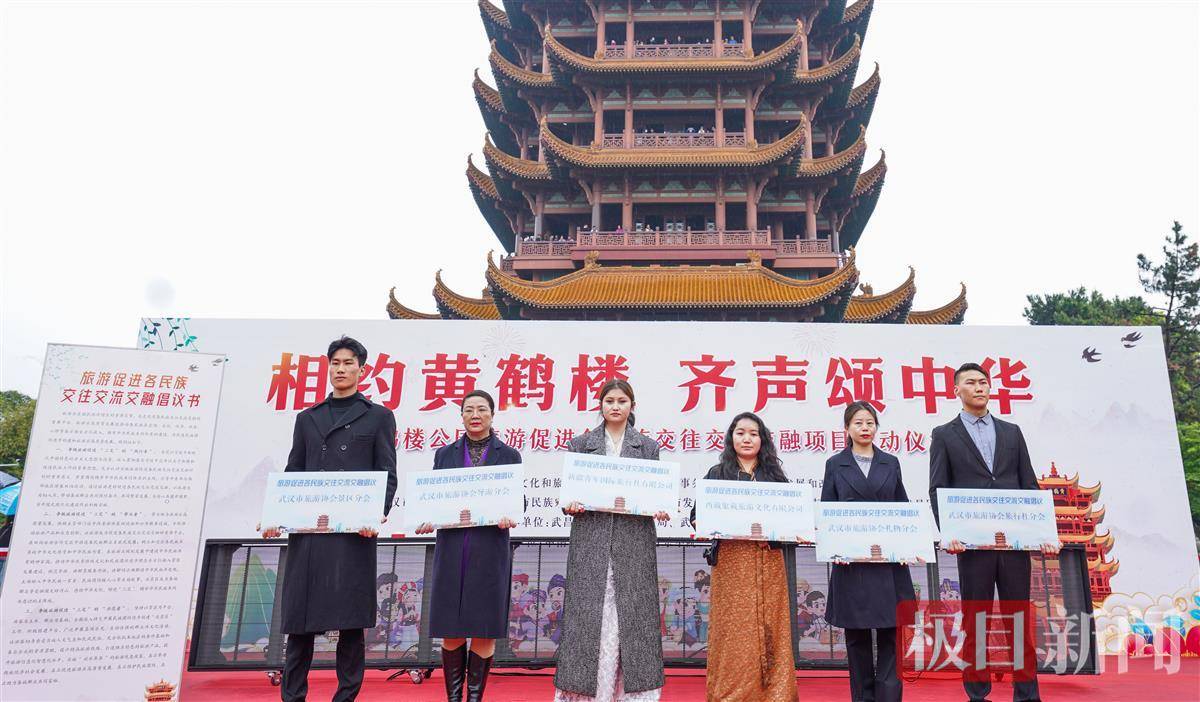 在启动仪式上,旅游行业代表共同宣读《旅游促进各族群众交往交流交融倡议书》,与会嘉宾共同启动“相约黄鹤楼齐声颂中华——黄鹤楼公园旅游促进各民族群众交往交流交融项目”。
