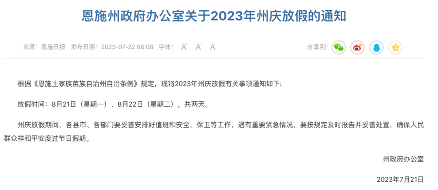 今年7月21日,湖北恩施州政府办公室提前一个月发布州庆放假相关通知称,根据《恩施土家族苗族自治州自治条例》规定,2023年州庆放假时间为8月21日(星期一)、8月22日(星期二),共2天。