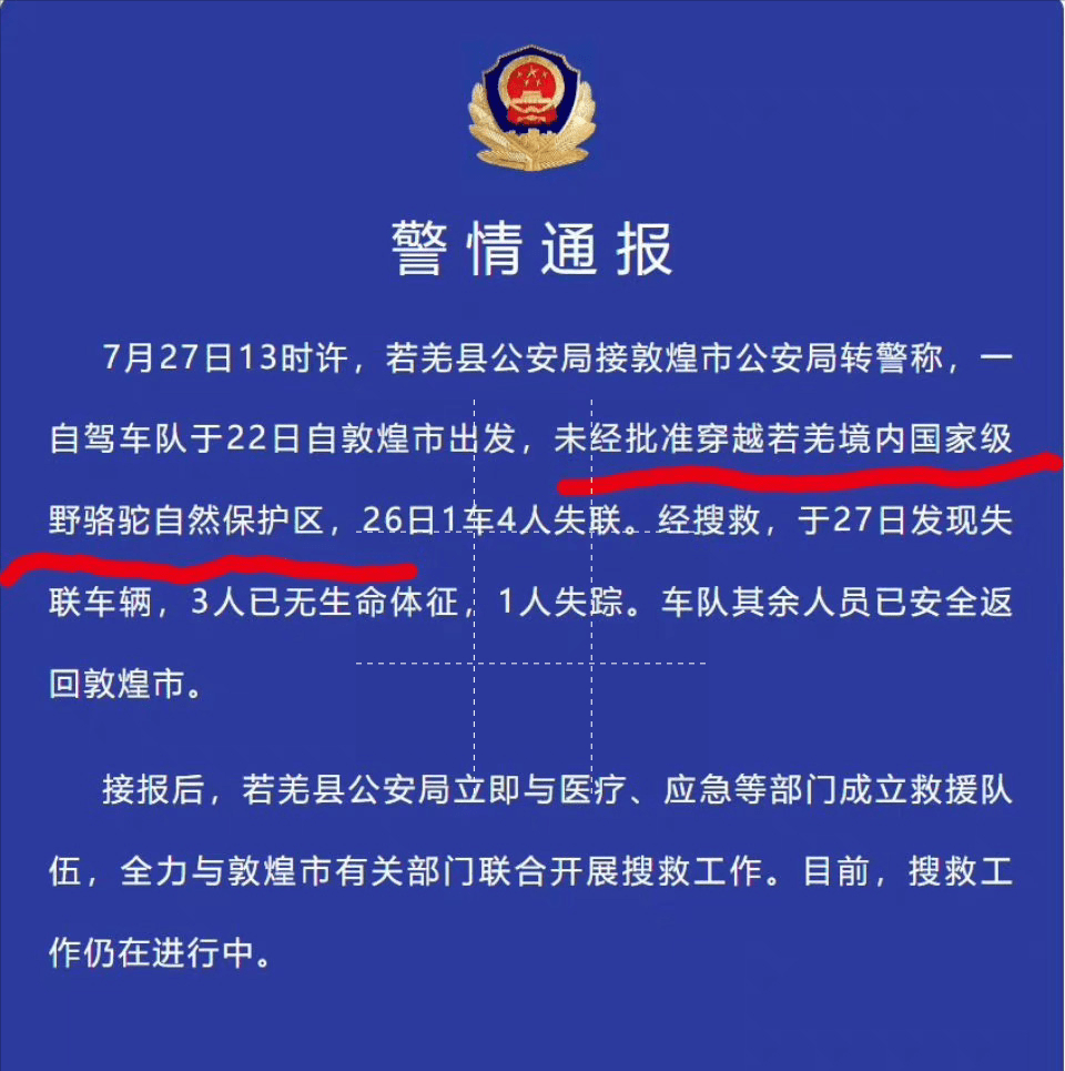 7月22日一自驾车队自敦煌市出发,未经批准穿越若羌境内国家级野骆驼自然保护区,26日1车4人失联。经搜救,于27日发现失联车辆,3人已无生命体征,1人失踪。车队其余人员已安全返回敦煌市。
