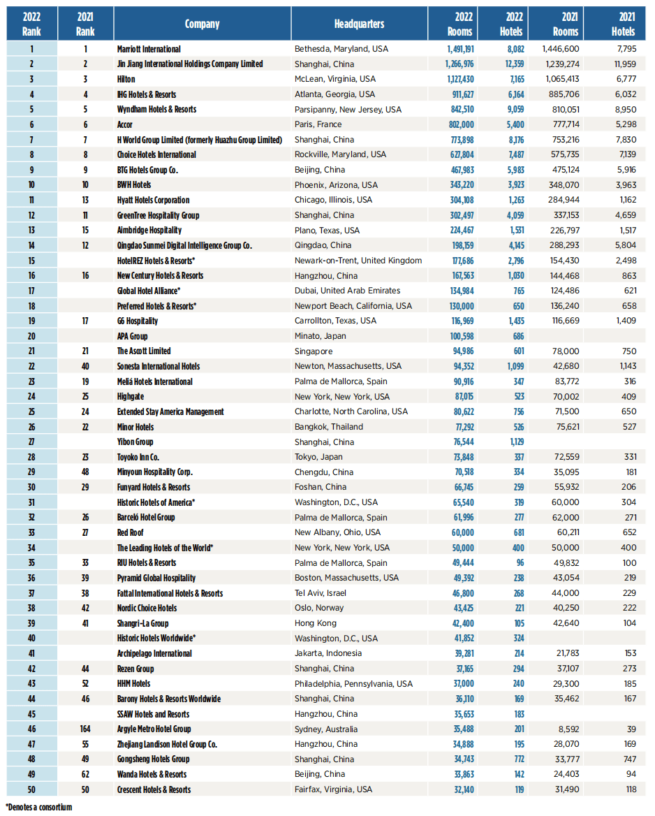 2023年7月消息:国际知名的权威酒店行业杂志《HOTELS》公布了2022年度“全球酒店集团200强”(HOTELS 200)。榜单以各酒店集团的客房数量进行排名,与酒店的建筑设备、服务质量、管理水平无关。