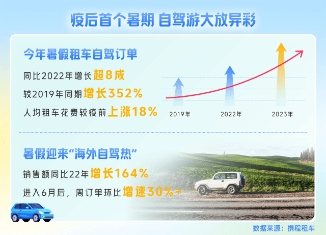 此外,出境游市场迈入复苏进程,今年暑假也迎来了“海外自驾热潮”。携程数据显示,暑期海外租车营业额同比增长164%,进入6月后周订单环比增速高于30%。