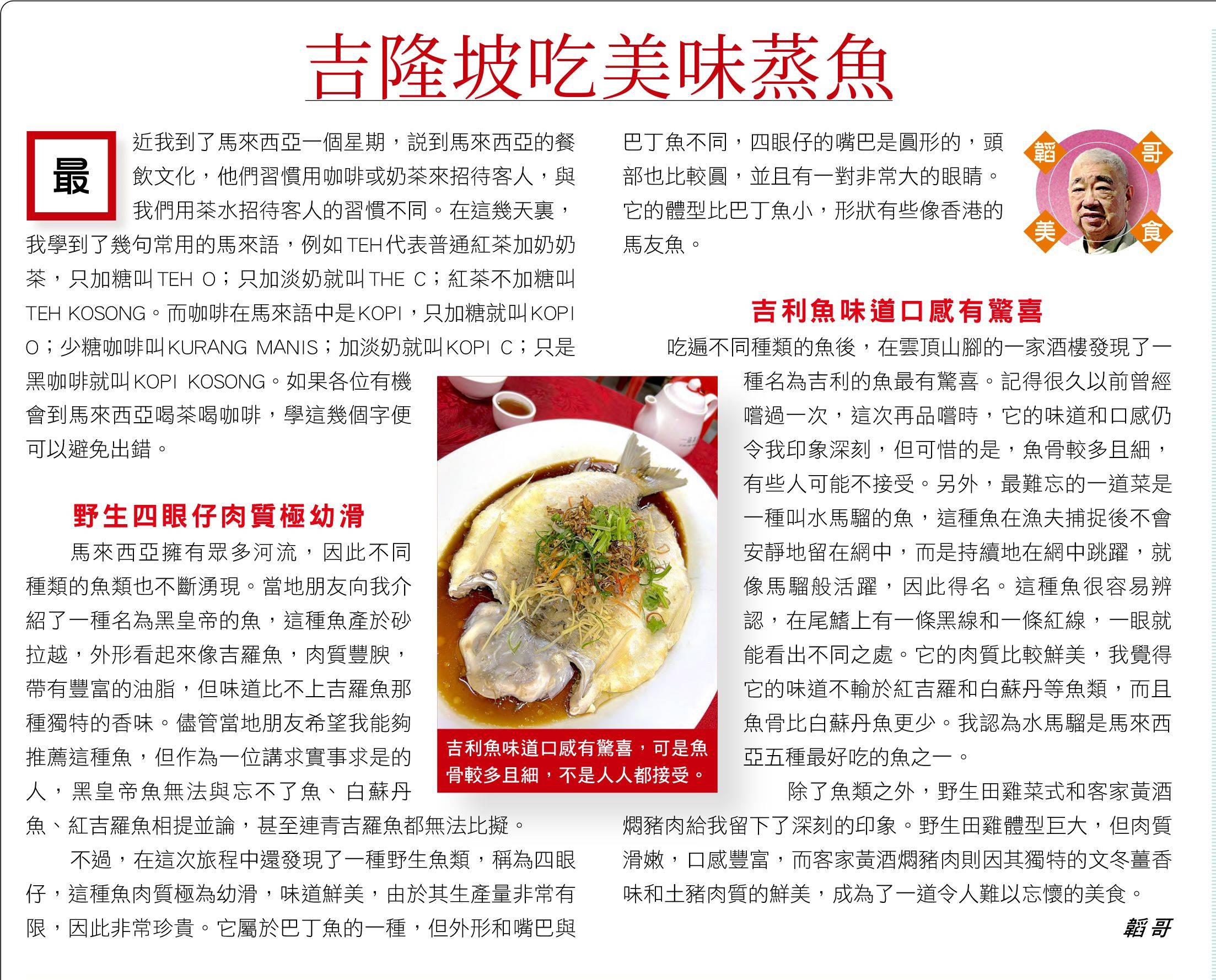 吃遍不同种类的鱼后,在云顶山脚的一家酒楼发现了一种名为吉利的鱼最有惊喜。记得很久以前曾经尝过一次,这次再品尝时,它的味道和口感仍令我印象深刻,但可惜的是,鱼骨较多且细,有些人可能不接受。另外,最难忘的一道菜是一种叫水马骝的鱼,这种鱼在渔夫捕捉后不会安静地留在网中,而是持续地在网中跳跃,就像马骝般活跃,因此得名。这种鱼很容易辨认,在尾鳍上有一条黑线和一条红线,一眼就能看出不同之处。它的肉质比较鲜美,我觉得它的味道不输于红吉罗和白苏丹等鱼类,而且鱼骨比白苏丹鱼更少。我认为水马骝是马来西亚五种最好吃的鱼之一。