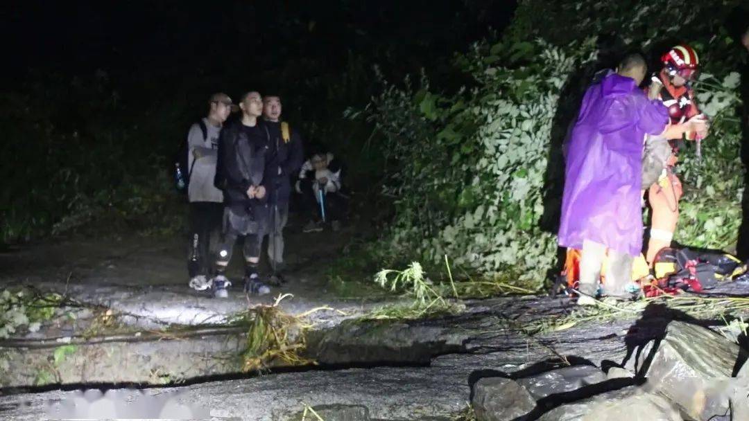 一组消防员在当地向导的指引下来到一深山处,将2名走散的“驴友”找到,另一组消防员来到另外9名被困“驴友”地点附近,侦查发现河道水流湍急,水位还在持续上涨,情况十分危急。