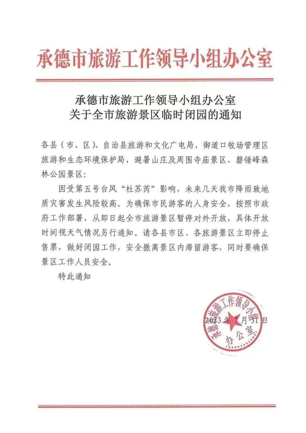 因受第五号台风“杜苏芮”影响,未来几天我市降雨致地质灾害发生风险较高。为确保市民游客的人身安全,按照市政府工作部署,从即日起全市旅游景区暂停对外开放,具体开放时间视天气情况另行通知。请各县市区、各旅游景区立即停止售票,做好闭园工作,安全撤离景区内滞留游客,同时要确保景区工作人员安全。
