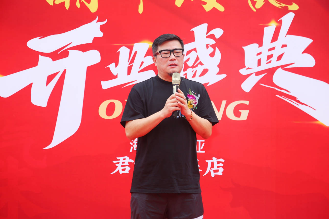 海南星久源餐饮连锁董事长杨国先生,三亚市原常务副市长何隆玉先生,潮牛海记创始人沈知明先生,兴业银行三亚分行行长张帆先生,三亚椰林书苑海垦地产有限责任公司副总经理王辉先生,三亚市人民调解协会理事,三亚周口商会秘书长,天津润和投资集团三亚分公司经理张旭东先生,北京泰和商业董事长郝颜涛先生,海南水姿源保健养生服务有限公司董事长张超先生为潮牛海记君和君泰店剪彩。