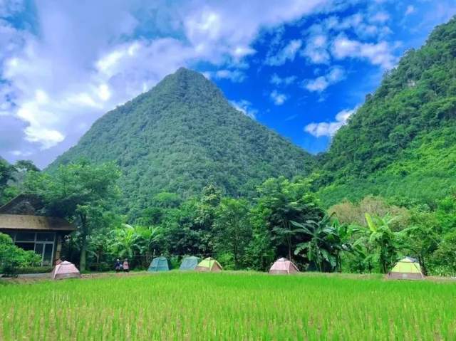 成片绿油油的稻田、色彩绚丽的帐篷