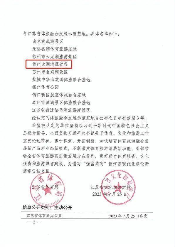 近日,江苏省体育局、江苏省文化和旅游厅联合发布2023年江苏省体旅融合发展示范基地认定名单,包括 常州太湖湾露营谷在内的10家单位成功入选。