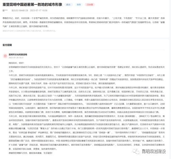 非常感谢您对昆明市文化和旅游业的关注和关心,您关于“让昆明避暑气候王者的形象以正视听,提升昆明的城市形象”等建议非常好,我们将认真研究,结合实际推进有关工作。