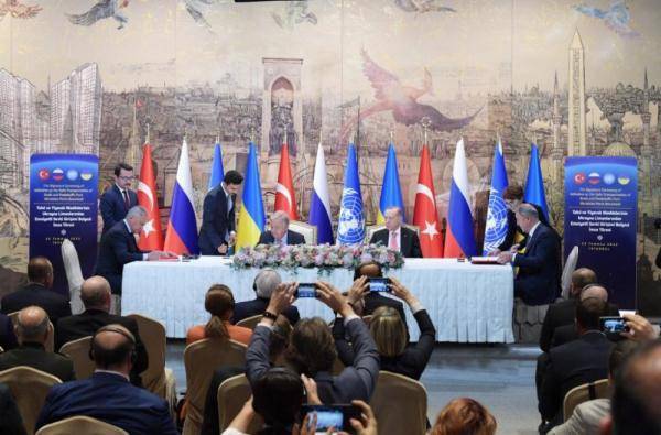 2022年7月22日,在土耳其伊斯坦布尔多尔玛巴赫切宫,土耳其国防部长阿卡尔(右)、联合国秘书长古特雷斯(中左)与俄罗斯国防部长绍伊古(左)在签署协议。当日,土耳其、俄罗斯、乌克兰和联合国代表在土耳其最大城市伊斯坦布尔就从黑海港口外运农产品问题举行签署协议仪式。新华社记者沙达提摄