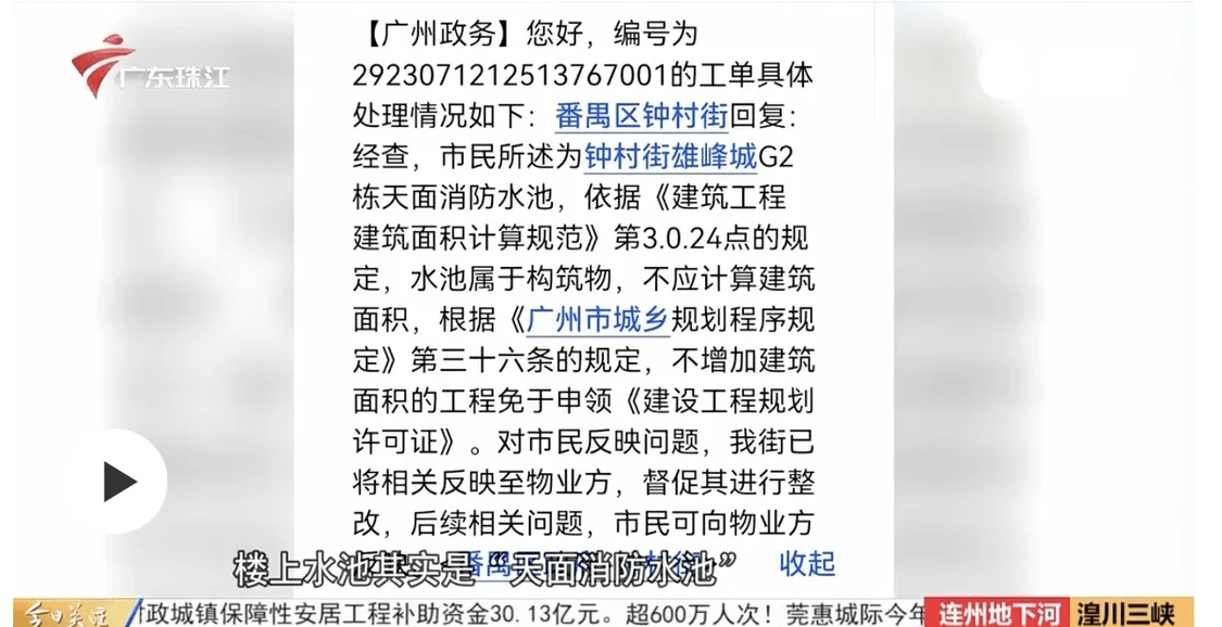 番禺区钟村街道办曾回复居民投诉称,此处天台水池是“天面消防水池”。 微信公众号“广东台今日关注”图