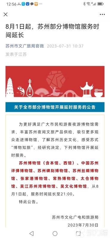 根据苏州市民文化广电和旅游局7月30日的《关于全市部分博物馆开展延时服务的公告》,苏州博物馆(含本馆、西馆)、中国苏州评弹博物馆、苏州碑刻博物馆、苏州丝绸博物馆、张家港博物馆、常熟博物馆、太仓博物馆、吴江苏州湾博物馆、吴文化博物馆,从8月1日起,服务时间延长至21:00。