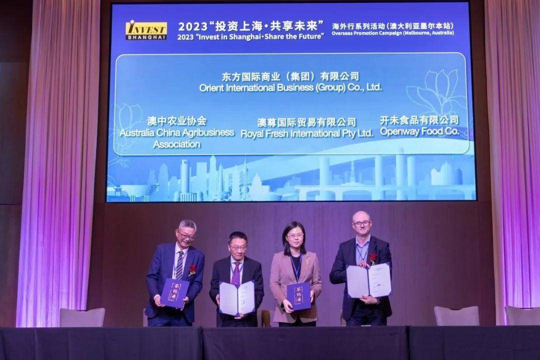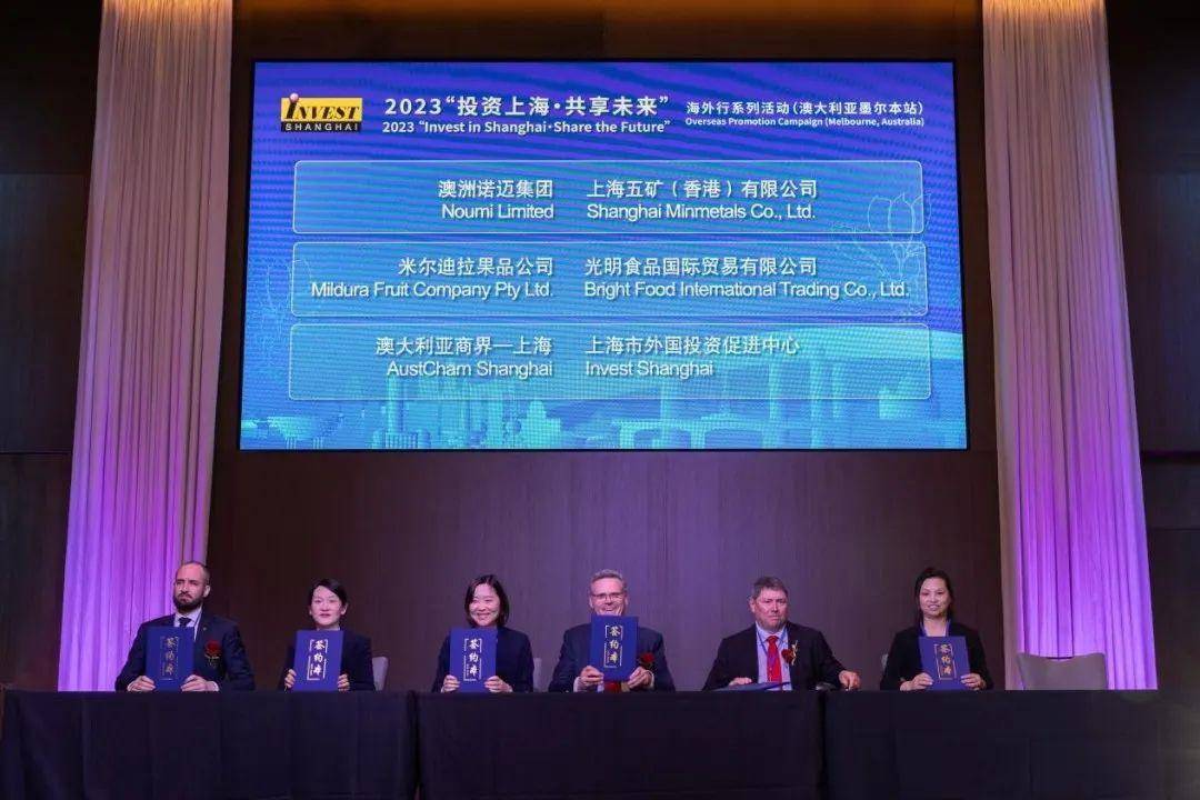 推介会上,沪澳企业、机构间10个合作项目现场签约,涵盖了食品、农产品采购,生物医药和高端居家护理合作,康复医院投资等领域。其中,上海东方国际商业集团公司、上海五矿有限公司、光明集团分别与澳中农业产业协会、澳尊国际贸易有限公司、开未食品有限公司、诺迈集团、米尔迪拉果品公司签署食品、农产品等采购协议。上海虹桥国际中央商务区、国和投资有限公司分别与澳大利亚SMS Healthcare集团、澳洲PHC集团、澳大利亚佑信医疗集团和Bioclub签署医疗健康、居家服务、生物医药等投资合作项目。上海外国投资促进中心与澳大利亚商界-上海签署投促合作备忘录。