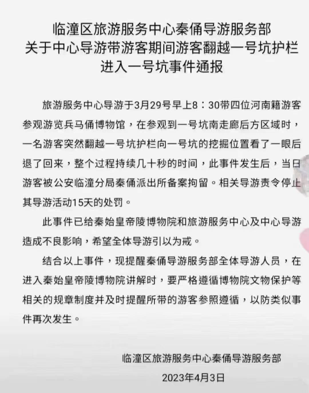 临潼区旅游服务中心发布的通报表示:3月29日四位河南籍游客参观游览兵马俑,一名游客突然翻越一号坑护栏,向一号坑的挖掘位置看一眼后退回来,整个过程持续几十秒。此事件发生后,当日该游客被秦俑派出所备案拘留,相关导游责令停止其工作15天。
