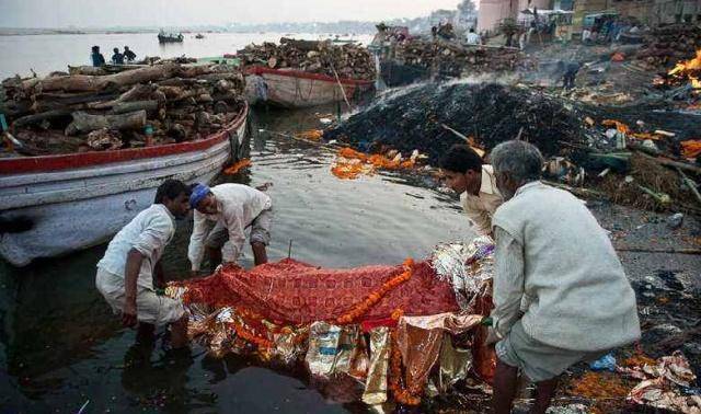 在恒河上,有数十座焚烧尸体的"火葬场"。这些火葬场,其实是寺庙,常年堆满了木柴,一旦运来尸体,立即就能上去烧,烧完的骨灰直接撒入恒河,让死者实现永生。
