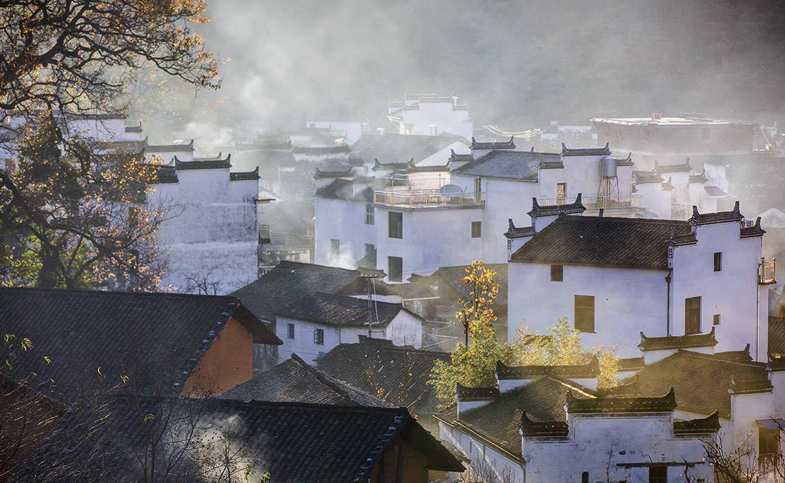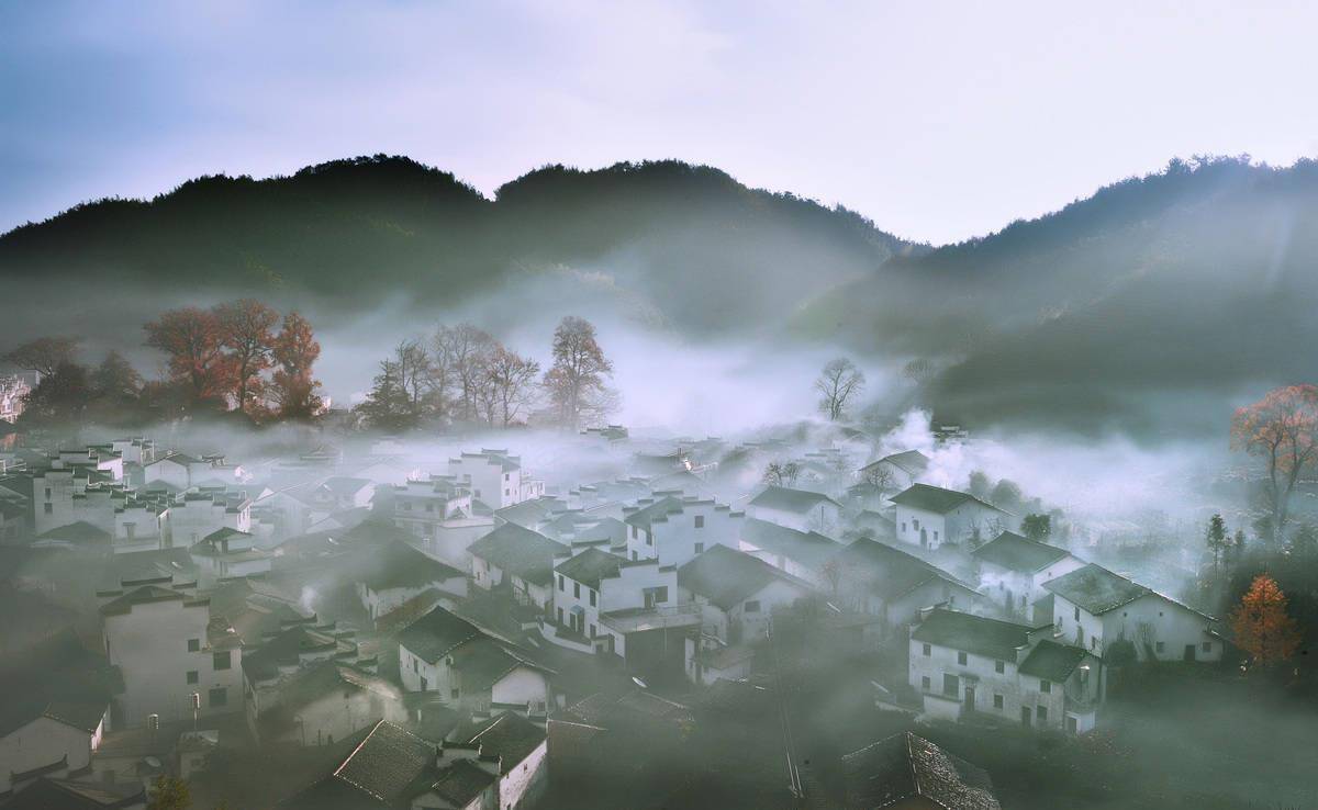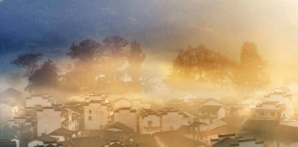 它的美丽在于群山环绕的孤立氛围。在那光芒的照耀下,美不胜收,唯有炊烟袅袅,光影浮动,若隐若现,当真是仙境一般。
