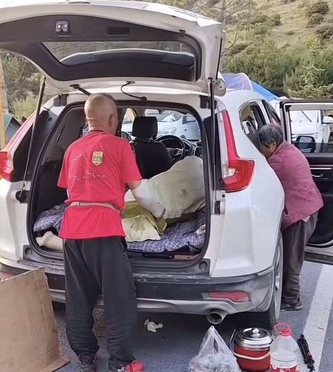 旅途中大爷还备足了柴火、电热毯怕大妈冷;备了安全帽以防大妈随时摔倒磕到头;给大妈弄了方便上厕所的凳子等,细节也做得到位。