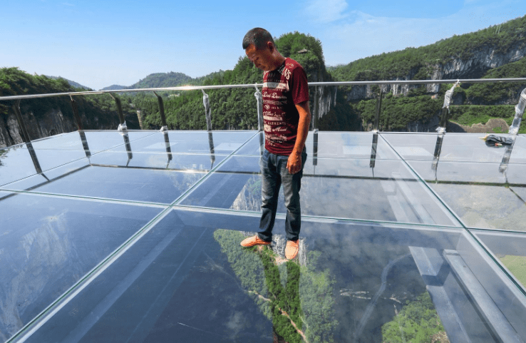 而天生三桥悬崖玻璃眺台就建在跨度最大的天龙桥的天坑悬崖顶上,眺台悬空外挑11米,长26米,垂直高度达280米,相当于近100层楼的俯瞰高度,它也是世界现在单体面积规模最大的玻璃眺台,非常考验体验者的勇气与胆量,对心理素质也有极大的挑战。