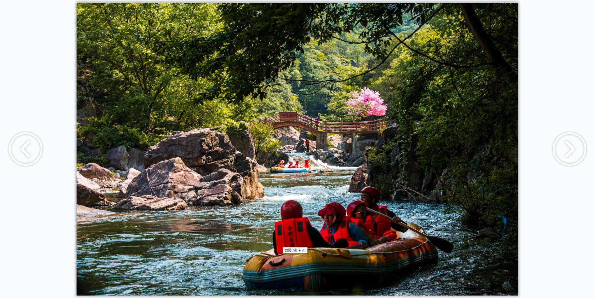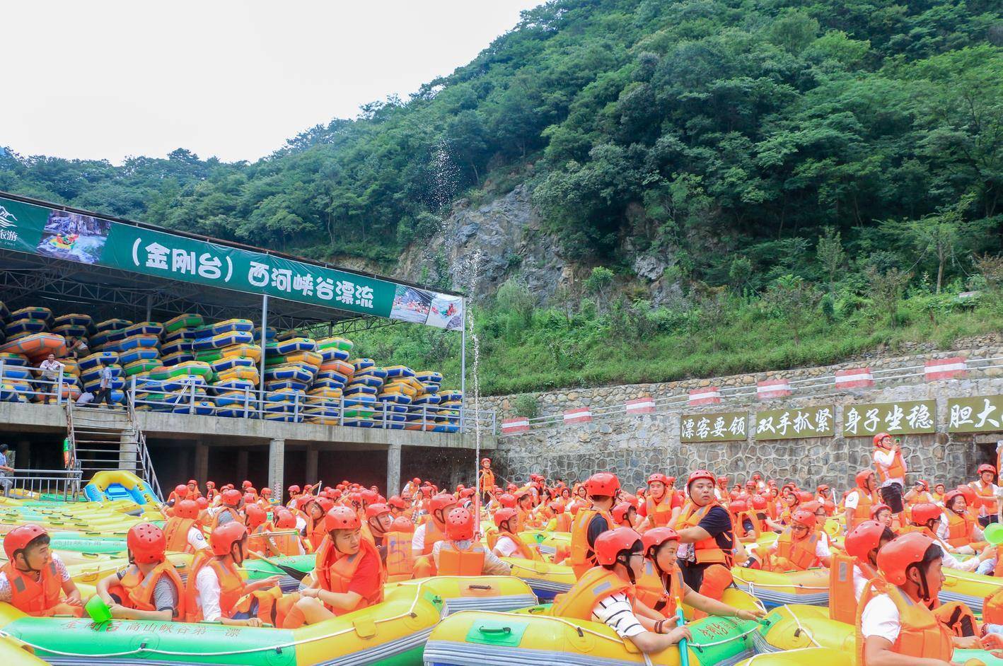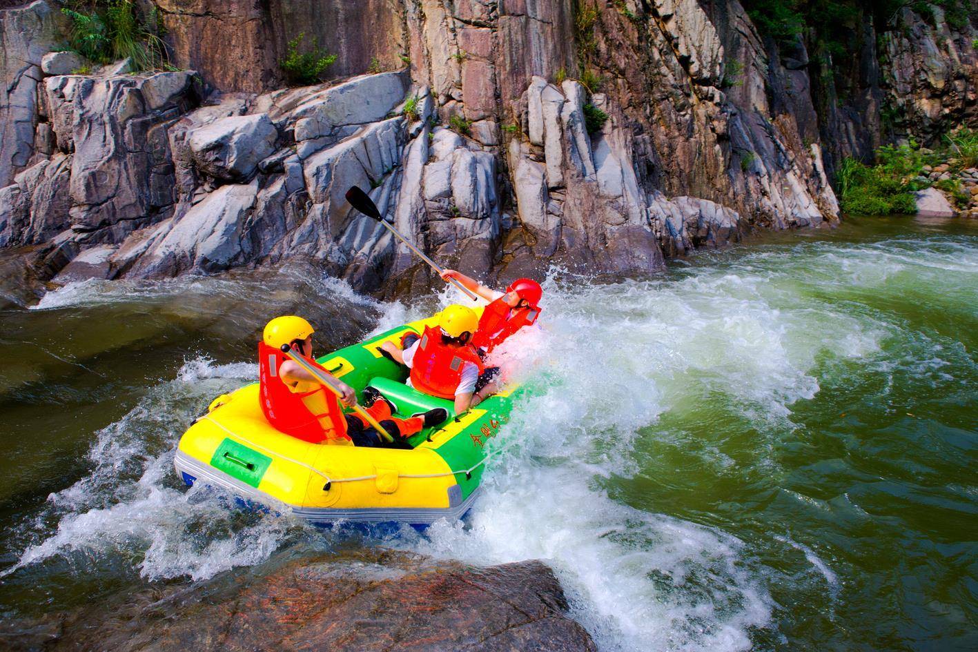 遇上周末,天气晴好,峡谷漂流现场更是人头攒动,游客们身穿救生衣,头戴安全帽,乘坐橡皮艇,从清凉的水花中一跃而过,一路漂荡、一路欢叫,穿丛林、越山谷,用移动的视角欣赏沿途美景,让肺部感受清新和凉爽。