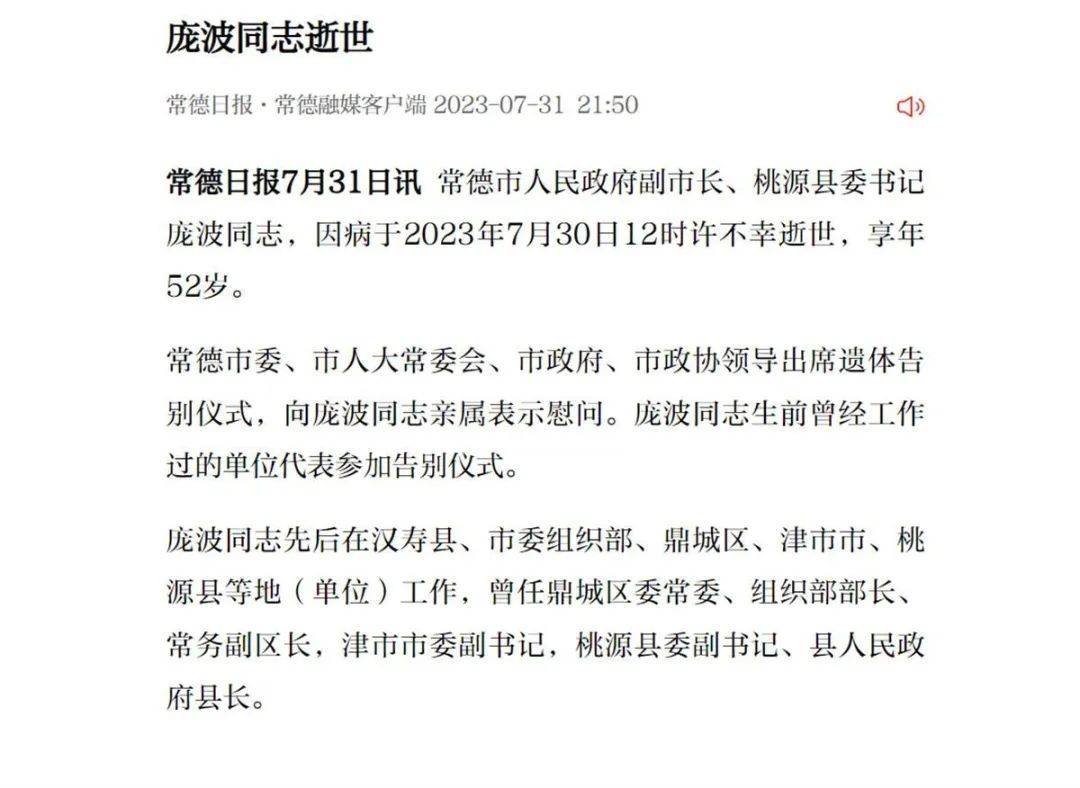 7月31日晚,据常德融媒客户端消息,常德市人民政府副市长、桃源县委书记庞波,因病于2023年7月30日12时许不幸逝世,享年52岁。